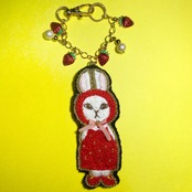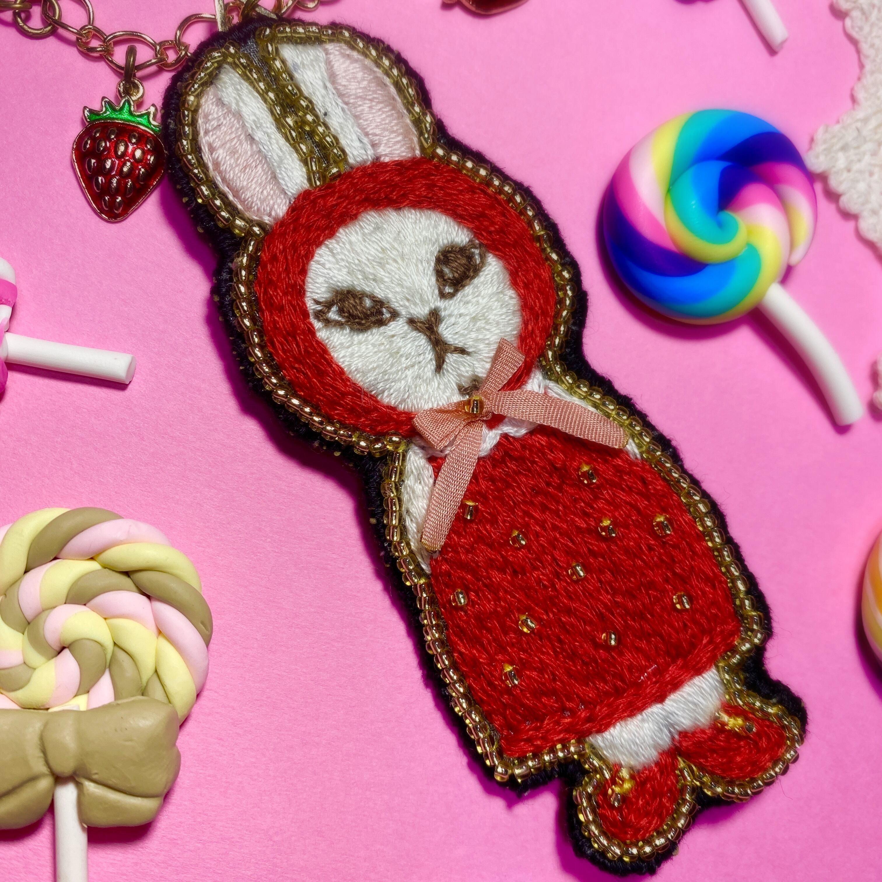 赤ずきんうさちゃんの刺繍とイチゴとパールのパーツがついています♡
