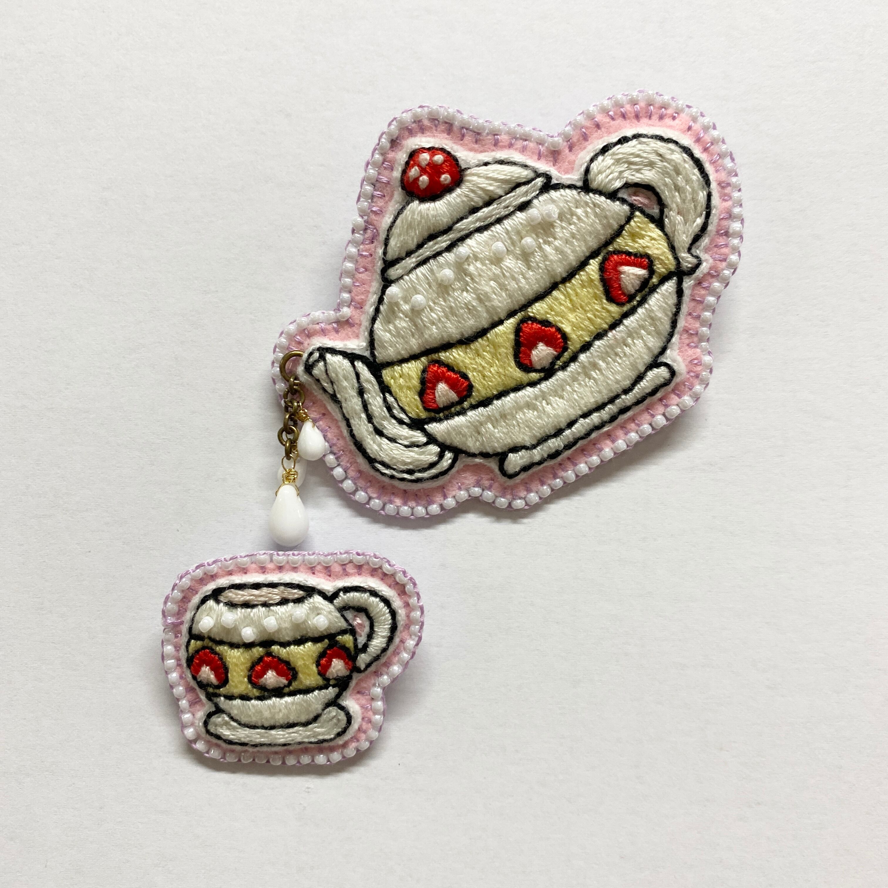 1針ずつ手縫いで表現したモチーフに紅茶が注がれる瞬間をドロップ型のビーズで表現しました♡