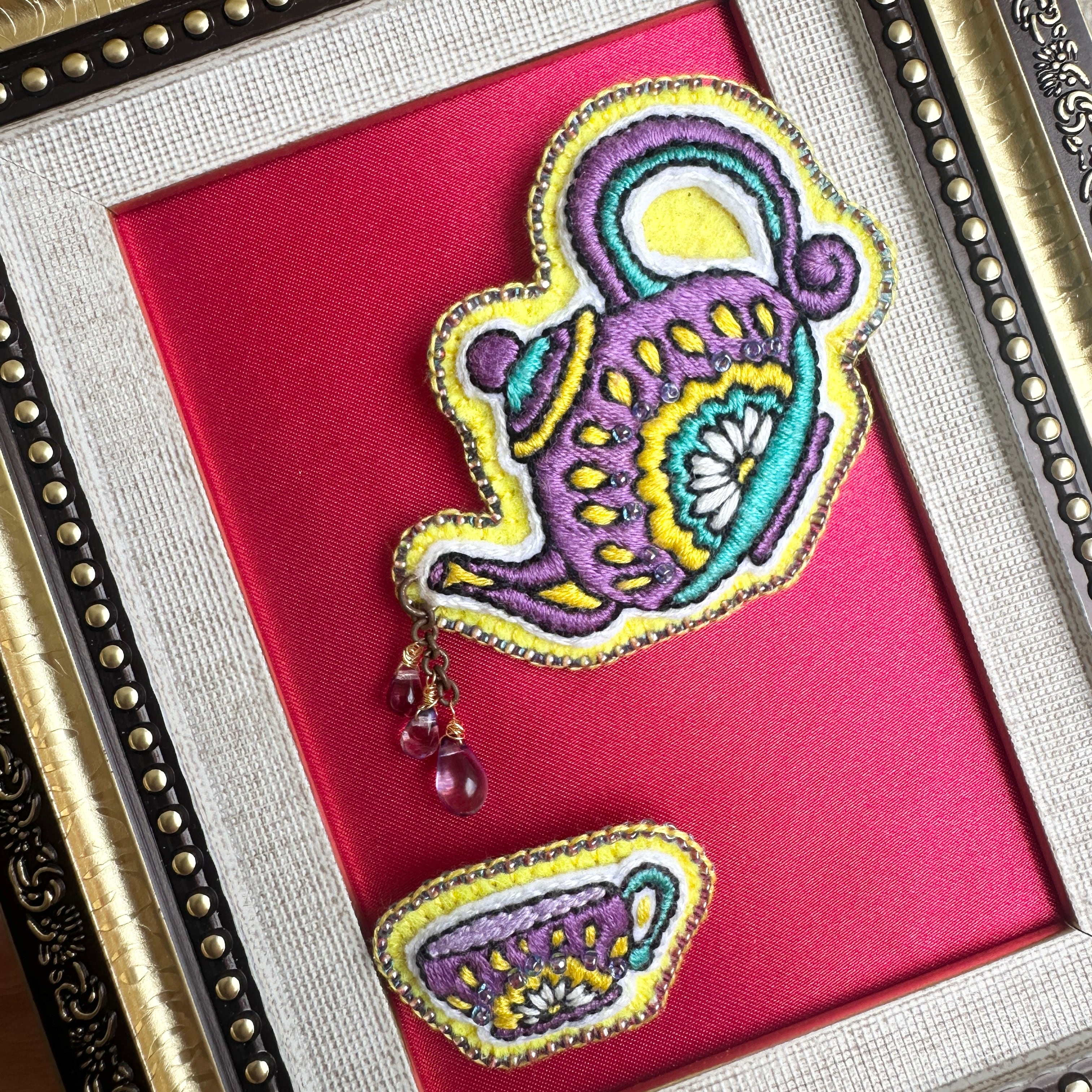1針ずつ手縫いで表現したモチーフに紅茶が注がれる瞬間をドロップ型のビーズで表現しました♡