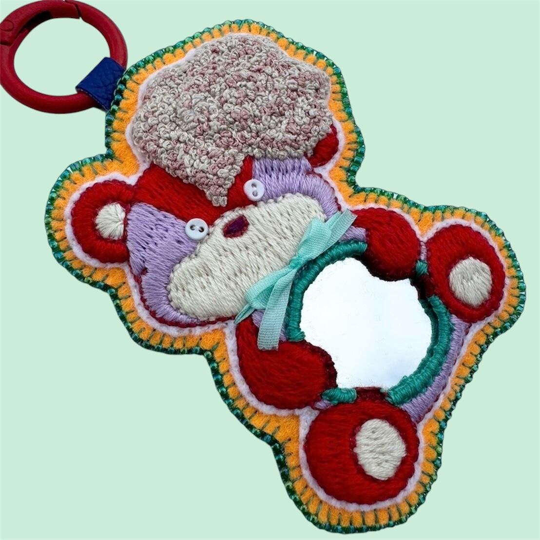 鏡を抱えたテディベア『パッチ』/刺繍キーホルダー